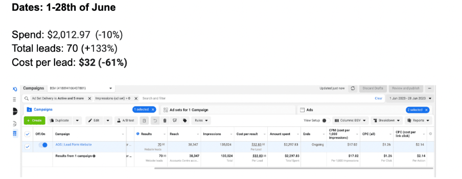 Cost per Lead: The cost per lead has experienced a substantial decrease of 61%. This achievement is significant, as it means the campaign has over-delivered on target KPIs and managed to acquire leads at a significantly lower cost.